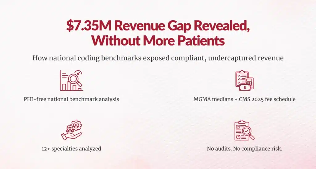 For one multi-specialty healthcare organization, the answer emerged with striking clarity using a PHI-free coding benchmark analysis. The national coding benchmark analysis uncovered revenue opportunities that was upto $7.35 million in compliant, undercaptured revenue without increasing patient volume, renegotiating payer contracts, or changing clinical workflows.