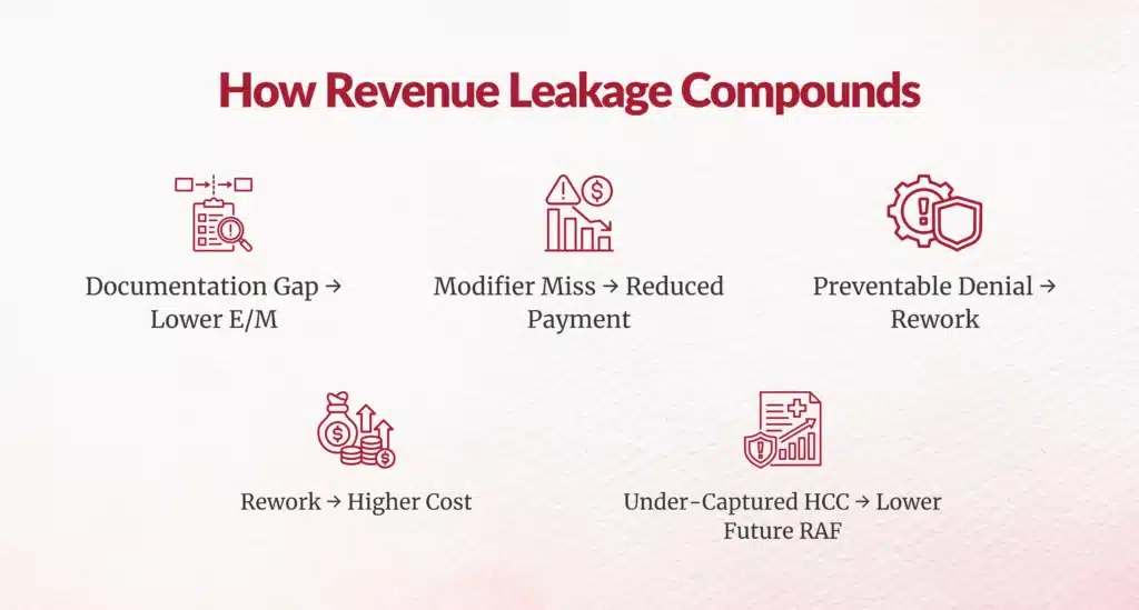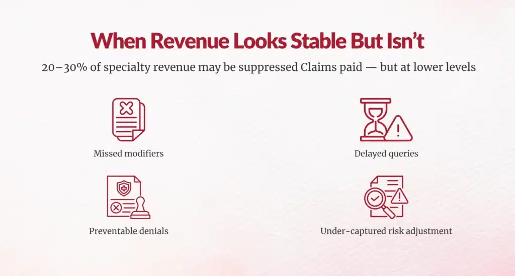 Revenue suppression in specialty groups is cumulative. It emerges across multiple touchpoints in the documentation and billing lifecycle.