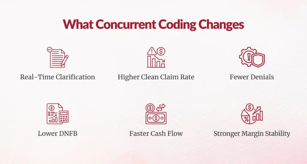 Rework, appeals, and repeated documentation reviews increase cost to collect. By reducing preventable errors, concurrent coding lowers operational expense and preserves margin.