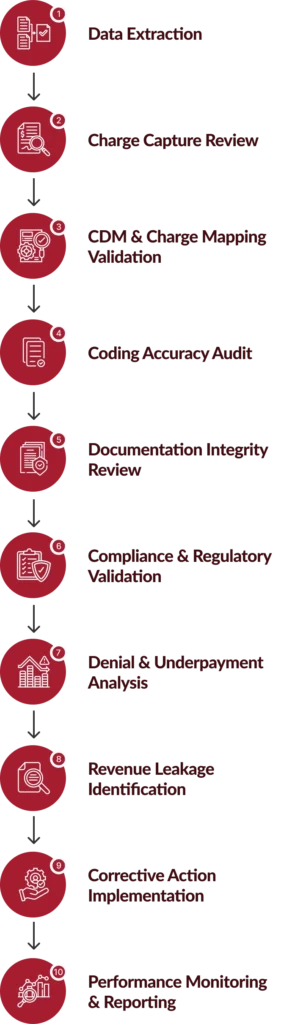 Our structured approach combines analytics, clinical expertise, and compliance reviews to identify revenue risk, strengthen charge accuracy, and improve reimbursement performance.