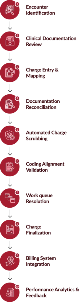 A structured, technology-enabled workflow ensures accurate medical charge capture, strengthens charge capture accuracy, and accelerates compliant revenue charge capture across the RCM lifecycle.