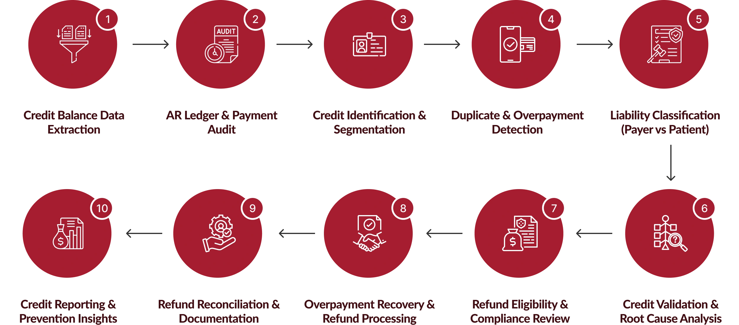 Structured audits detect aged credits and accelerate overpayment recovery services within transactional reimbursement models.