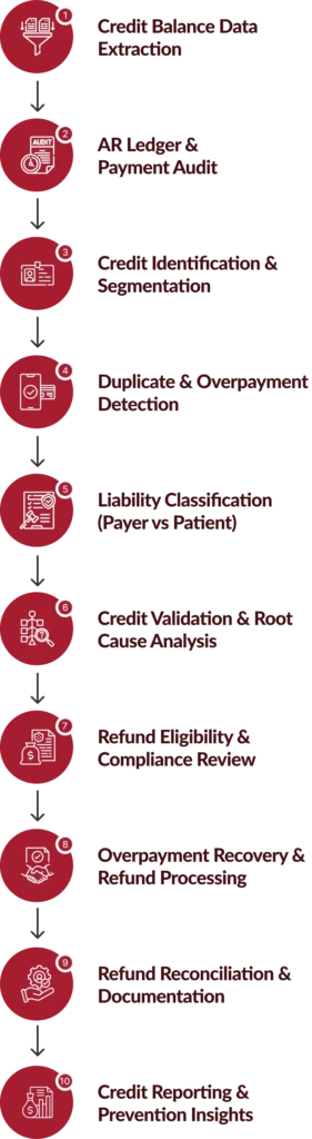 We follow a standardized resolution framework designed to streamline investigations, reduce refund delays, and optimize enterprise-wide RCM credit balance services performance.